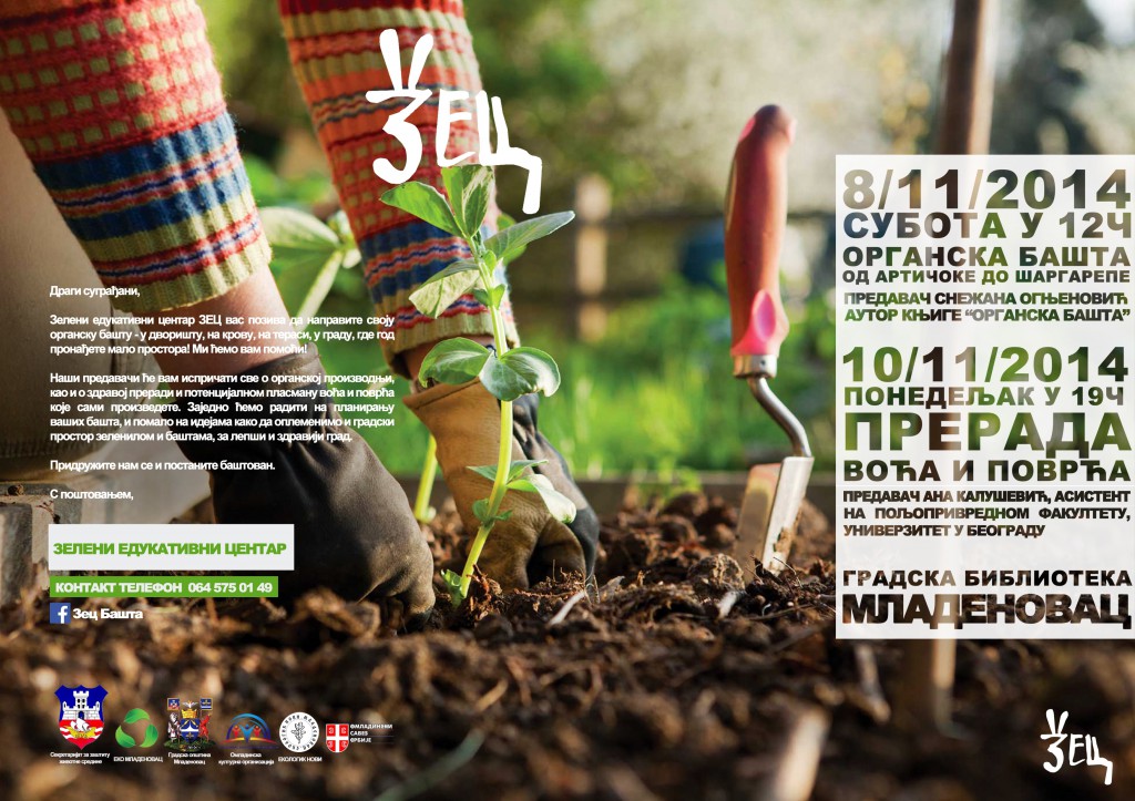 pozivamo građane Mladenovca i okoline da prisustvuju predavanju o Organskom baštovanstvu koji se organizuje u okviru projekta ZEC (Zeleni Edukativni Centar) u subotu 8.novembra u Gradskoj biblioteci u 12 časova.